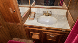 The plane’s interior screams royalty: plush crimson velvet seats, rich wood paneling, and even a “high-tech” television for its time. It features one large room with ample seating, a compact kitchen, and a surprisingly spacious lavatory—complete with more velvet and a fancy sink.