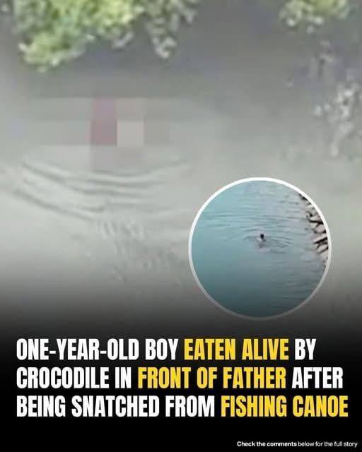 As the father cast his line, he noticed a sudden disturbance in the water. Within seconds, a crocodile surged upward and clamped its jaws around the child. Acting on instinct, the father attacked the reptile with his fists, desperately trying to save his son. But the crocodile dragged both of them into the river, and despite the father’s frantic struggle, it disappeared with the infant before witnesses could intervene.
