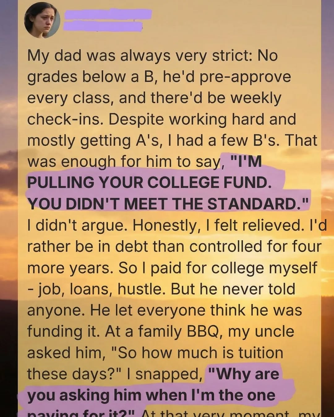 My dad was always extremely strict. No grades below a B, no choosing my own classes without his approval, and weekly check-ins to make sure I stayed on track. Even though I worked hard and earned mostly A’s, the few B’s I did get were enough for him to declare, “I’m pulling your college fund. You didn’t meet the standard.” I didn’t argue. Strangely, a part of me felt relieved. Life under his rules had always felt like walking a tightrope where the slightest wobble counted as failure. Losing the college fund hurt, but it also meant I could finally make choices for myself without trying to meet his impossible expectations.