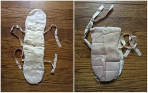 1. “What is this padded satin item with ribbon ties and a hole in the middle? Appears possibly handmade, like a case for a beauty item.”