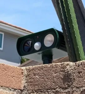 It’s an ultrasonic cat deterrent and dog chaser. It has a motion sensor and flashing lights to protect courtyards, lawn Gardens, and fruit trees.