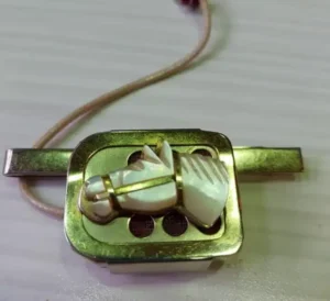 12. “Found this in our donation bin. It’s a gold-plated speaker with a short cord with 2 prongs at the end, it also has a gold-plated clip with an opal-like material of a horse on it.”