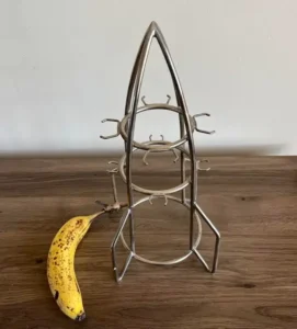14. “Metal rocket-shaped holder for something.”
