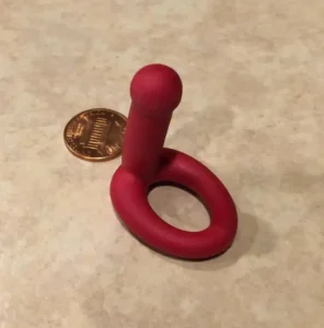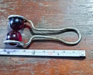 2. “I found this metal spring thing with 2 red glass balls. It can be separated, and the balls do come out. It’s a little over 3 inches. Looks like a pair of tongs holding the red balls.”